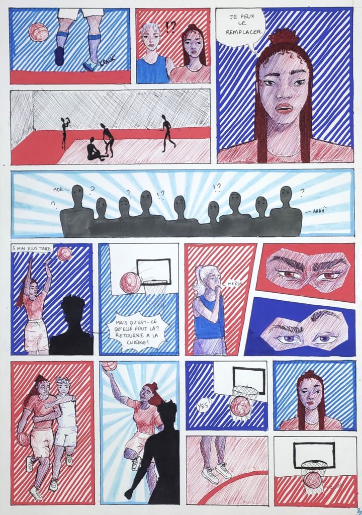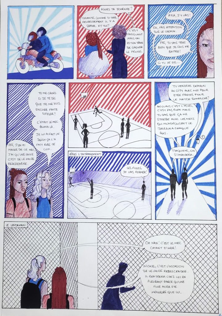En fin d’année de première STD2A, on a commencé un projet de BD militante. N’ayant pas eu le temps de le finir avant la fin de l’année, on l’a rendu après les vacances d’été, à la rentrée en terminale.