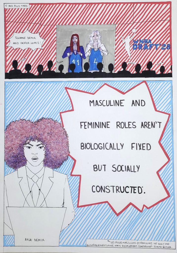 Cette BD est militante et engagée, puisqu’elle a pour but de dénoncer le sexisme banalisé, notamment dans les domaines sportifs. Sloane doit faire sa place et montrer qu’elle a de la valeur, ce qui n’est pas une mince affaire. Comme quoi, le féminisme est toujours d’actualité : oui, en France nous avons tous les mêmes droits, mais premièrement, dans beaucoup d’autres pays du monde, ce n’est toujours pas le cas; et deuxièmement, même en France, les remarques et comportements misogynes persistent toujours. Comme le dit la grande soeur de Sloane sur la dernière planche de la BD lors de son discours : « Les rôles masculins et féminins ne sont pas biologiquement fixés mais socialement construits » (Judith Butler).